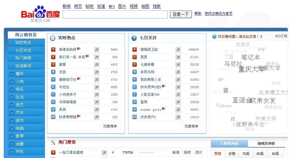 8月23日晚百度搜索風云榜新版正式上線,強大的產(chǎn)品功能和便捷的信息服務,為4億網(wǎng)民帶來了一次用戶體驗的完美升級!新版風云榜以百度每天數(shù)億次搜索為基礎,從用戶需求出發(fā),突出了開放、實時、全方位及整合四個新特點,目的是將百度風云榜打造成為最權威的中文搜索風云榜。